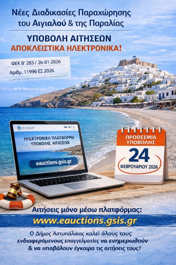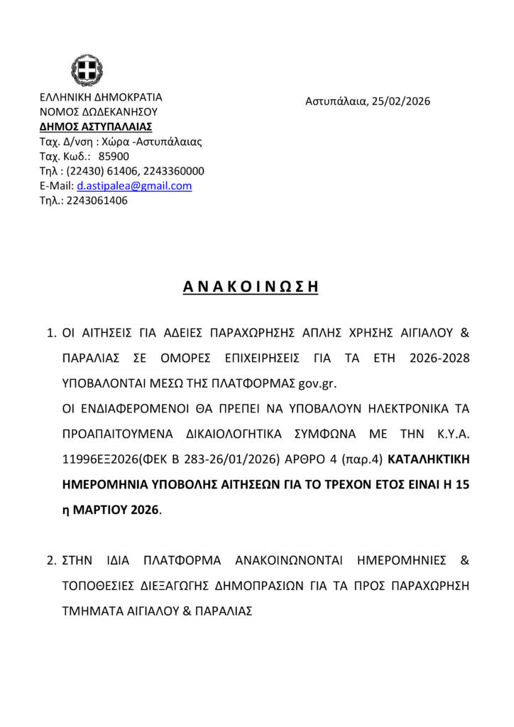ΑΝΑΚΟΙΝΩΣΗ ΠΑΡΑΧΩΡΗΣΗΣ ΑΠΛΗΣ ΧΡΗΣΗΣ ΑΙΓΙΑΛΟΥ & ΠΑΡΑΛΙΑΣ ΣΕ ΟΜΟΡΕΣ ΕΠΙΧΕΙΡΗΣΕΙΣ ΓΙΑ ΤΑ ΕΤΗ 2026-2028 / 25-02-2026